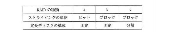 RAIDの種類a、b、cに対する組合せとして適切なものはどれか。