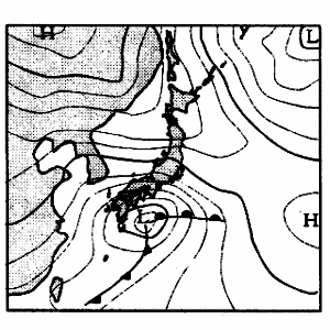 下図は、日本付近の地上天気図の一例(概略)を示したものである。この気圧配置における、 日本付近の気象状況について述べた次の文の( )の中にあてはまる語句の組み合わせとして適当なものは、下のうちどれか。