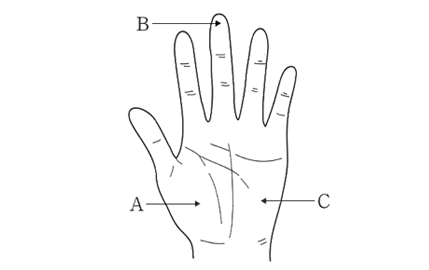 【A】小指球 ――【B】中指 ――【C】母指球