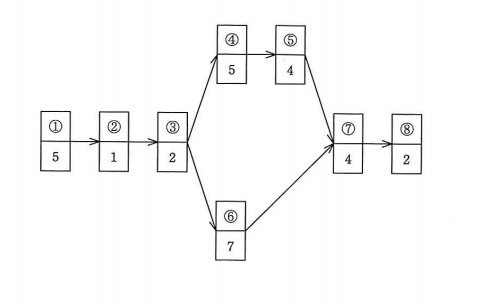 図に示す①~③の生産ラインの作業にA、B、Cの3人を配置し、Aに(①、②、③)、Bに(④、⑤)、Cに(⑥、⑦、⑧)を割り当てたとき、生産ラインに資材を投入する時間間隔は幾らか。ここで、作業①~⑧の下段に示す数値は、その作業の所要時間を表す。