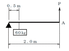 図のような「てこ」において、A点に力を加えて、質量60kgの荷を持ち上げるとき、これを支えるために必要な力Pは、1~5のうちどれか。ただし、重力の加速度は9.8m/s