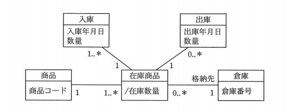 商品と倉庫の関係を、UMLを用いてデータモデルで表した。このモデルに関する記述のうち、適切なものはどれか。ここで、商品の倉庫間の移動はないものとする。
