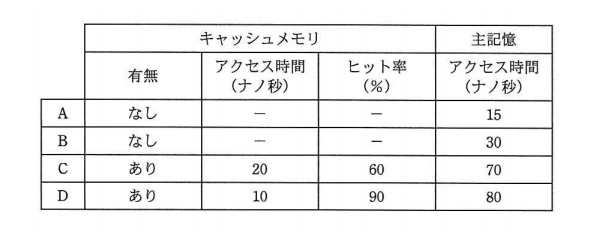 A~Dを、主記憶の実効アクセス時間が短い順に並べたものはどれか。