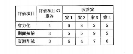 改善の効果を定量的に評価するとき、複数の項目で評価した結果を統合し、定量化する方法として重み付け総合評価法がある。表の中で優先すべき改善案はどれか。