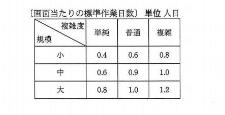全部で100画面から構成されるシステムの画面作成作業において、規模が小かつ複雑度が単純な画面が30、中規模かつ普通の画面が40、大規模かつ普通の画面が20、大規模かつ複雑な画面が10である場合の工数を、表の標準作業日数を用いて標準タスク法で見積もると何人日になるか。ここで、全部の画面のレビューに5人日を要し、作業の管理にレビューを含めた作業工数の20%を要するものとする。