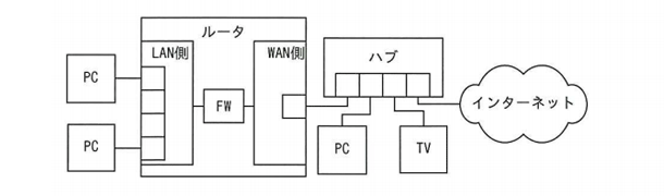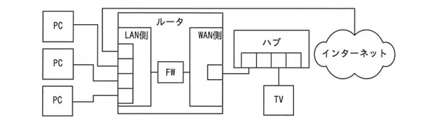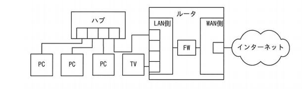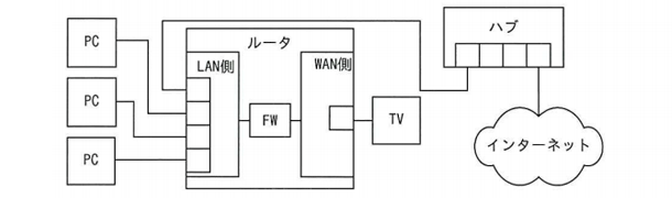 ファイアウォール機能付きルータとハブを用いて,PC3台とインターネット対応テレビをインターネットに接続したい。全ての機器に対して,ルータのファイアウォール機能が生かせる配線として適切なものはどれか。ここで,図中の“FW”はファイアウォール機能を示す。