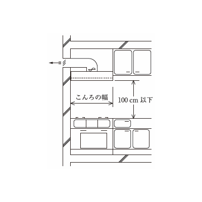 図に示す集合住宅の台所に設けられているレンジフードの最小有効換気量として、「建築基準法」上、正しいものはどれか。ただし、図の換気設備は国土交通大臣の性能規定による認定を受けていないものとする。
