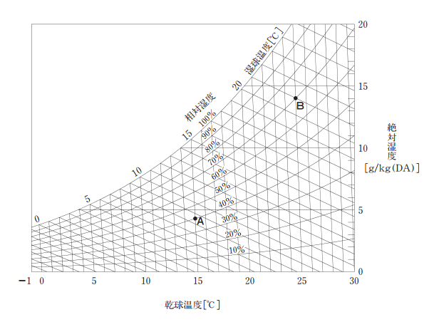 B点の空気を、A点の空気の状態にするには、冷却と同時に乾燥空気1kg当たり約 10gの減湿が必要である。