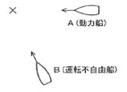 下図に示すように、航行中のA、B2隻の船舶が衝突するおそれがある場合、船舶の種類を問わず、常にBが避航船となるのは、次のうちどれか。(海上衝突予防法)