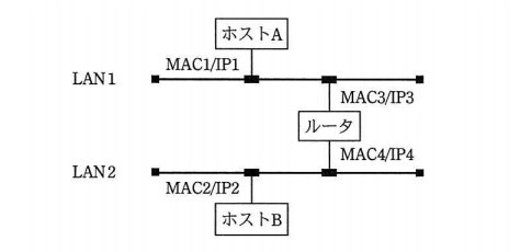 図のようなIPネットワークのLAN環境で、ホストAからホストBにパケットを送信する。LAN1において、パケット内のイーサネットフレームのあて先とIPデータグラムのあて先の組合せとして、適切なものはどれか。ここで、図中のMACn /IPm はホスト又はルータがもつインタフェースのMACアドレスとIPアドレスを示す。