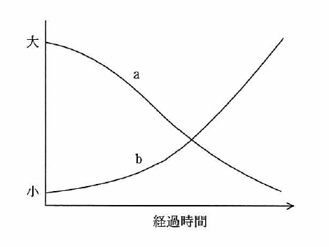 図は一般的なプロジェクトにおける開始から終結までの時間の経過に伴って変動する要素について表している。a、bに対応する要素の適切な組はどれか。