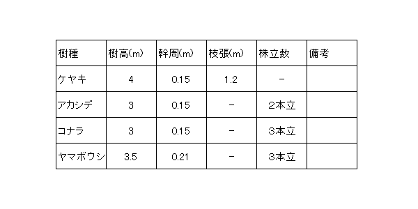 3本立のコナラで、樹高がそれぞれ3.1 m、2.9 m、2.7 m で、幹周がそれぞれ0.08 m、0.05 m、0.05 m のもの。